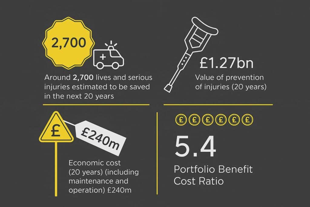 In 2023 and 2024, the Secretary of State for Transport announced further funding for the Safer Roads Fund, totalling £95m, allocated to upgrading a further 45 of England’s ‘most investable’ local A road routes, selected using the Road Safety Foundation’s Crash Risk Mapping analysis of 2014-2019 data. In total, a further 280 miles of road were eligible for these improvements.
